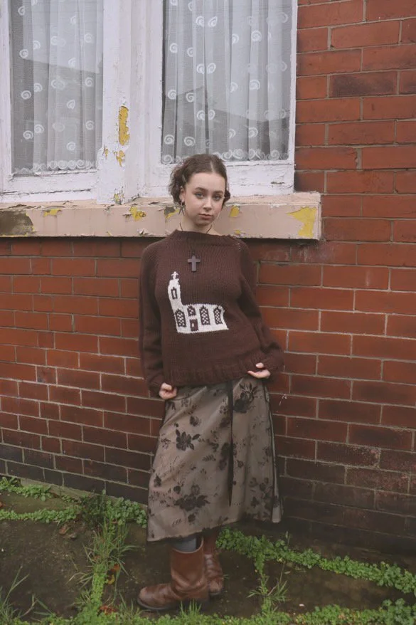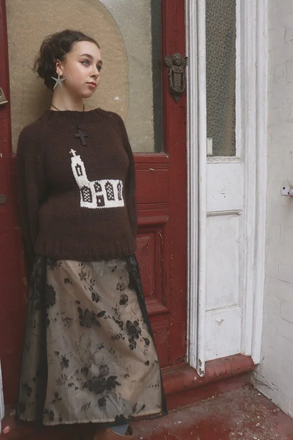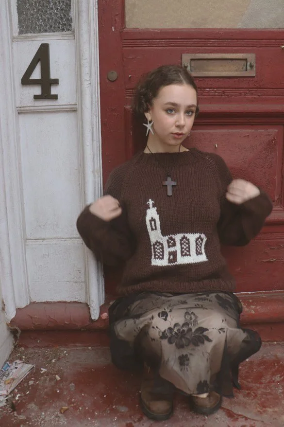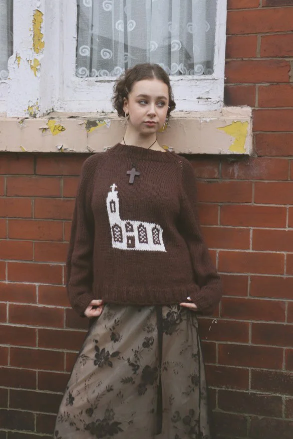 Church Jumper knitted by me, photographed and edited by Kacey Mossman, modelled by Lily Robyn Davies.